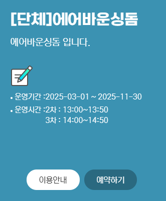 각 체험 시설이나 물놀이터 등은 운영 시간 및 예약·문의 연락처가 별도로 안내되어 있습니다.